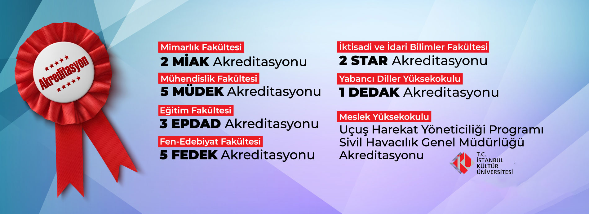 Fakülte / MYO Bölüm Akreditasyon Geçerlilik Süresi Akreditasyon Kuruluşu Akreditasyon Belgesi İktisadi ve İdari Bilimler Fakültesi İşletme (Türkçe) 15 Mayıs 2027 STAR Uluslararası Ticaret ve Finansman (Türkçe) 02 Nisan 2028 STAR Uluslararası Ticaret ve Finansman (İngilizce) 02 Nisan 2028 STAR Mimarlık Fakültesi Mimarlık (Türkçe) 20 Şubat 2029 MİAK-MAK Mimarlık (İngilizce) 20 Şubat 2026 MİAK-MAK Mühendislik Fakültesi Bilgisayar Mühendisliği (İngilizce) 30 Eylül 2026 MÜDEK Bilgisayar Mühendisliği (İngilizce) 30 Eylül 2026 EUR-ACE Etiketi Endüstri Mühendisliği (İngilizce) 30 Eylül 2026 MÜDEK Endüstri Mühendisliği (İngilizce) 30 Eylül 2026 EUR-ACE Etiketi İnşaat Mühendisliği (İngilizce) 30 Eylül 2024 MÜDEK İnşaat Mühendisliği (İngilizce) 30 Eylül 2024 EUR-ACE Etiketi Elektrik-Elektronik Mühendisliği (İngilizce) 30 Eylül 2024 MÜDEK Elektrik-Elektronik Mühendisliği (İngilizce) 30 Eylül 2024 EUR-ACE Etiketi Elektronik Mühendisliği (İngilizce) 30 Eylül 2017 MÜDEK Elektronik Mühendisliği (İngilizce) 30 Eylül 2017 EUR-ACE Etiketi İnşaat Mühendisliği (Türkçe) 30 Eylül 2024 MÜDEK İnşaat Mühendisliği (Türkçe) 30 Eylül 2024 EUR-ACE Etiketi Eğitim Fakültesi Rehberlik ve Psikolojik Danışmanlık 16 Nisan 2027 EPDAD Okul Öncesi Öğretmenliği 01 Mayıs 2026 EPDAD İngilizce Öğretmenliği 01 Mayıs 2026 EPDAD Fen-Edebiyat Fakültesi İngiliz Dili ve Edebiyatı 30 Eylül 2027 FEDEK Matematik ve Bilgisayar Bilimleri 30 Eylül 2027 FEDEK Moleküler Biyoloji ve Genetik 30 Eylül 2027 FEDEK Psikoloji 30 Eylül 2027 FEDEK Türk Dili ve Edebiyatı 30 Eylül 2027 FEDEK Meslek Yüksekokulu Uçuş Harekat Yöneticiliği Programı 31 Aralık 2025 SHGM Yabancı Diller Yüksekokulu Yabancı Diller Bölümü Mayıs 2030 DEDAK
