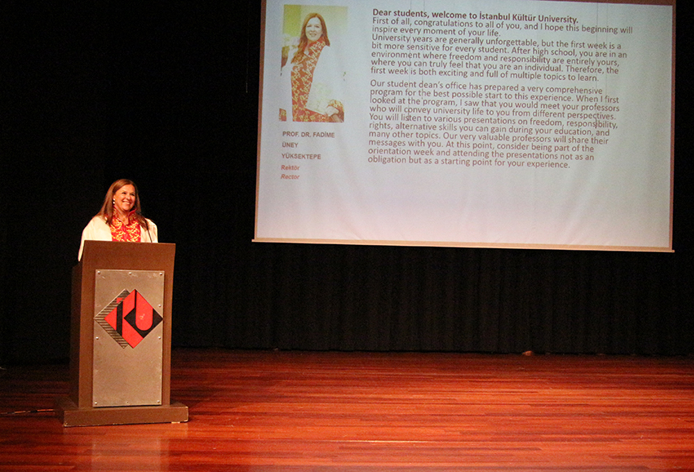 15 Eylül Pazartesi günü Akıngüç Oditoryumu ve Sanat Merkezi’nde başlayan “Oryantasyon Programı”nın sunuculuk görevlerini, Dış Ticaret Programı öğrencilerimizden Beyali Çeliktürk ve Mimarlık Bölümü öğrencilerimizden Nour El Omar üstlendiler. Programın açılış konuşmasını yapan Rektörümüz Prof. Dr. Fadime Üney Yüksektepe, köklü bir geçmişe dayanan ve insan ile Atatürk sevgisini temel alan bir vakfın kurduğu üniversitede öğrenim görmenin ayrıcalığını öğrencilerimizin yaşam boyu hissedeceklerini vurguladı.