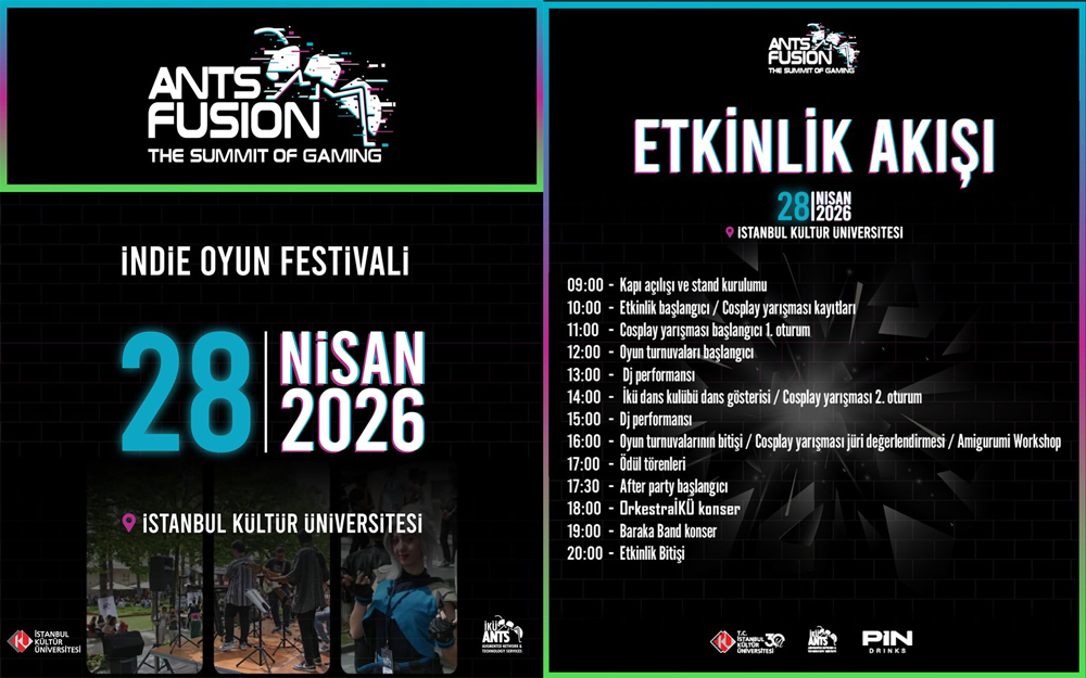 İstanbul Kültür Üniversitesi Tasarım Fabrikası olarak bu yıl üçüncüsünü düzenleyeceğimiz Ants Fusion 2026 Indie Oyun Festivali kapsamında sizleri aramızda görmekten büyük onur duyarız.